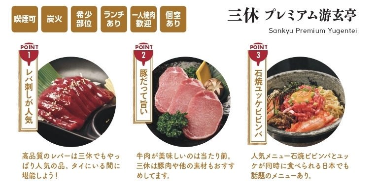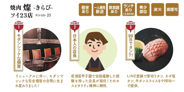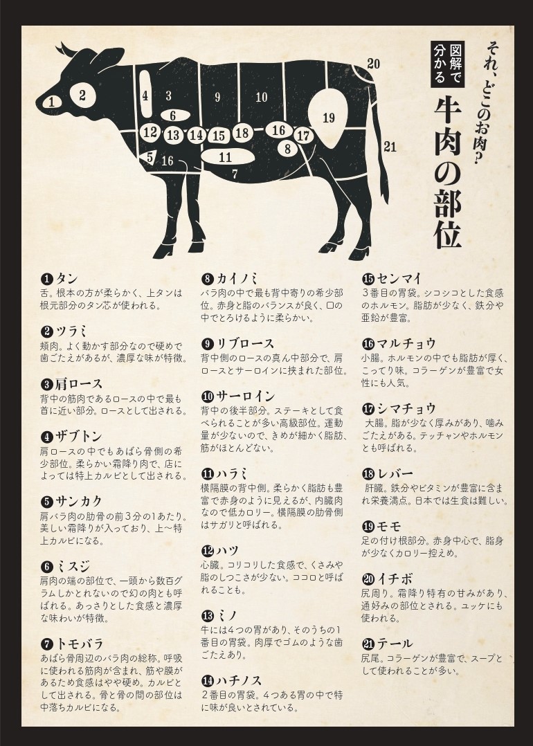1. 焼肉 燦 きらび ソイ23店|Kirabi 23 2. にく処 鈴㐂|Nikudokoro Suzuki 3. 黒牛の里|Kuroushi no sato 4. 近江牛 岡喜|Omigyu Okaki 5. またどーる|Matador 6. がるしあ|Garcia 7. ホルモン焼き肉 平嶋|Hirashima by Kirabi 8. 焼肉広島|Hiroshima 9. やす田|Yasuda 10. 三休|Sankyu Premium Yugentei 11. 田丸屋本店|Tamaruya Honten 牛肉の部位 岡喜&黒牛の里01. 焼肉 燦 きらび ソイ23店|Kirabi 23