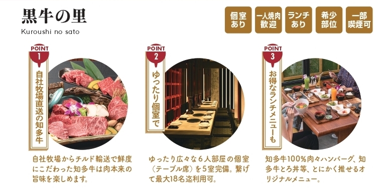 黒牛の里柔らかく甘みのある知多牛の肉質を損なわないよう、加工、輸送、保存、調理と全ての工程で一切冷凍することなく、愛知県の自社牧場より空輸。素性のしっかりした安心で安全な牛肉を、20年以上の経験を持つお肉のプロと生産者がおいしく美しく提供し、人びとを魅了する。