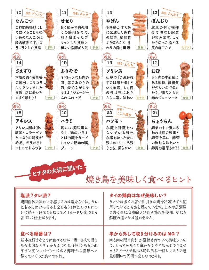 1. 伊勢 2. ヒナタ 3. 小料理みかみ 4. 蕎麦十番with六角 5. 馬酔木(あしび) 6. 地鶏料理 けん 7. 炭火焼 源 8. なぎ屋 9. 伊藤家 10. ケリーズ 11. みつもり 12. 鳥波多゛(とりはだ) 13. 酉玉 14. 鳥さわ22 どの部分を食べているの?01. 伊勢